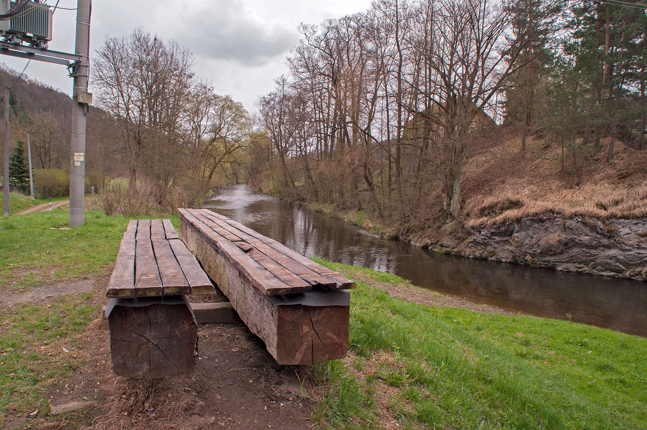 Svůj vůz můžete zaparkovat u cesty po odbočení přes nový most z hlavní silnice.